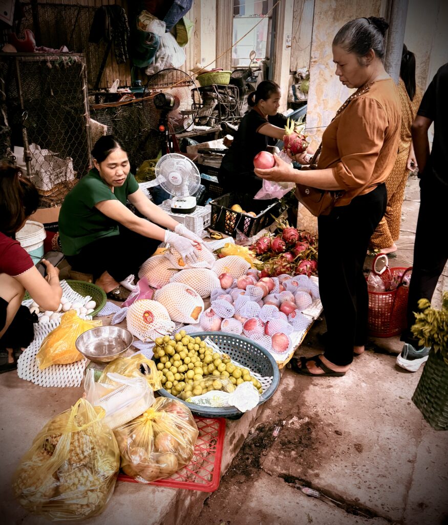 The bread was still warm—soft, golden, comforting in my hands as we wandered through Tam Coc’s morning market. Here, nobody called out prices or tried aggressively selling anything. Instead, the vendors simply smiled warmly, pointing quietly toward their fresh produce as we passed. Everything—fruit, vegetables, tofu, freshly cut meat, and bread rolls for banh mi—arrived at sunrise, perfectly fresh.