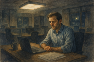 A Short story By the time the last intern left and the lights dimmed themselves into a soft hum, he was still there. At his desk. Staring at a spreadsheet that hadn’t changed in hours. The cursor blinked like it was waiting for him to confess something. He didn’t. To the untrained eye, he looked committed. Focused. Maybe even indispensable. But those who knew him—really knew him—would recognize the signs. The loosened tie, the untouched reheat of dinner, the three draft emails that would never be sent. Home was only twenty minutes …