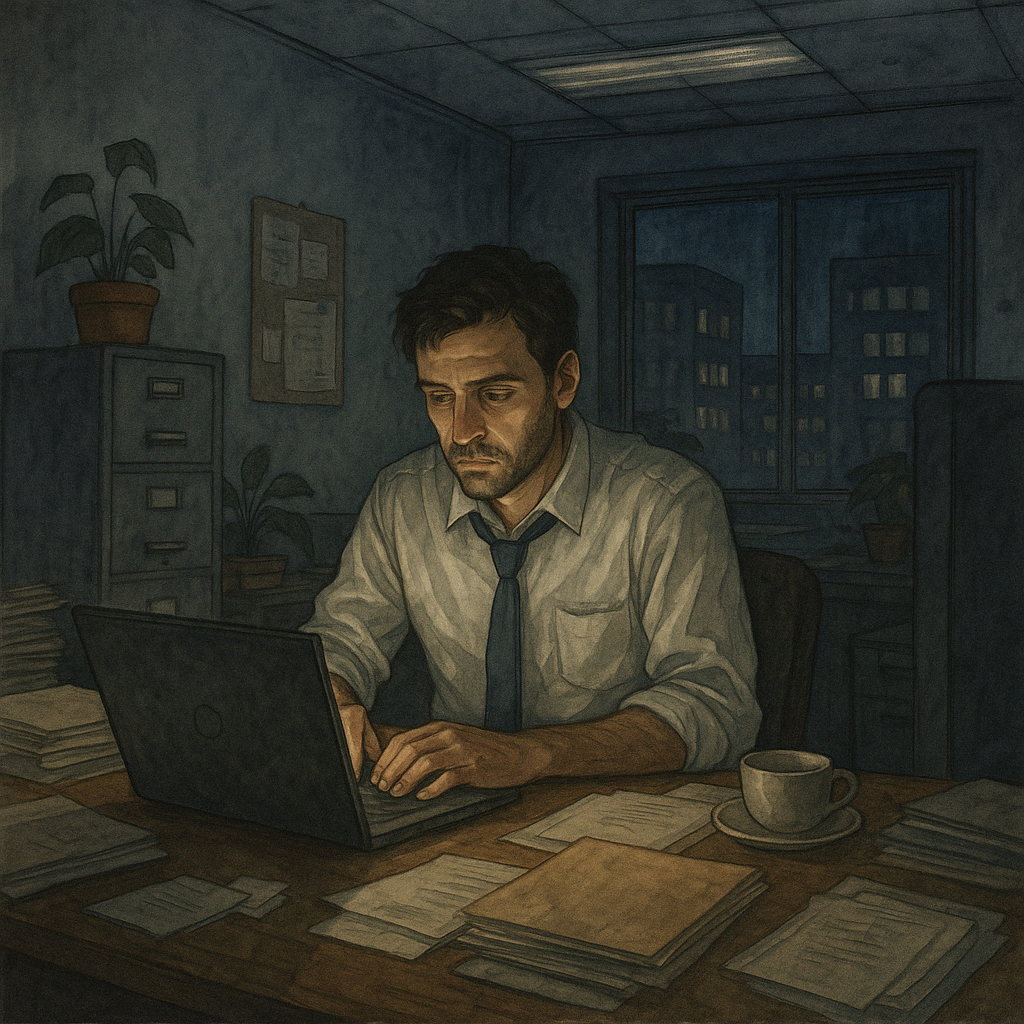 By the time the last intern left and the lights dimmed themselves into a soft hum, he was still there. At his desk. Staring at a spreadsheet that hadn’t changed in hours. The cursor blinked like it was waiting for him to confess something.